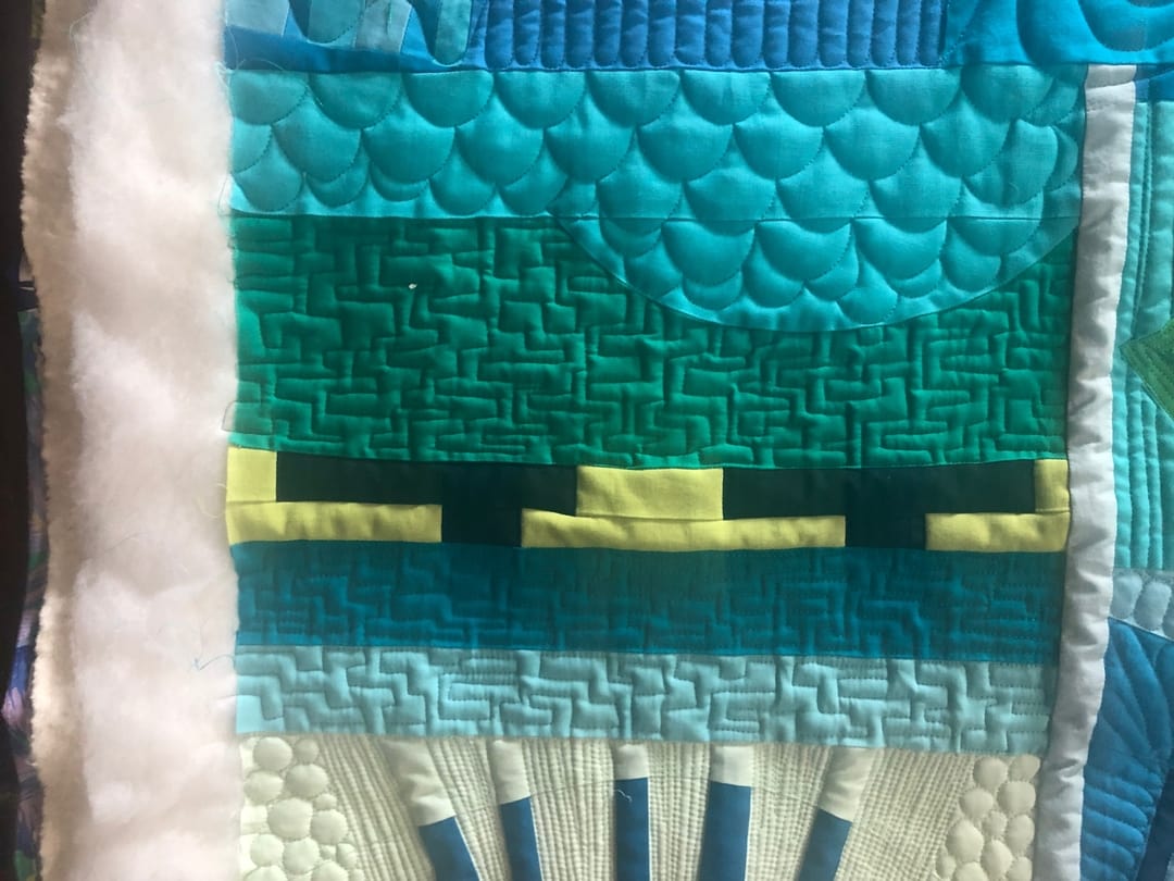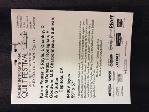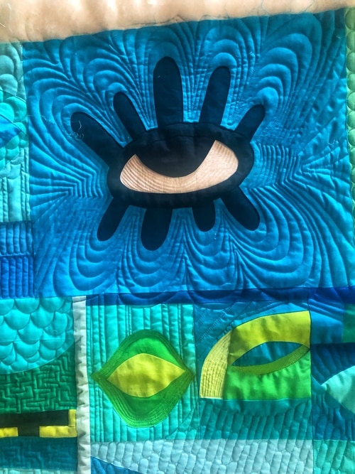 was very excited to help sister Karen @capitolaquilter with the completion on “Eyes”, a collaborative quilt that began in year three of the #Beesewcial Group. For the puzzling of this quilt Karen sewed 3 blocks and extensively used bridging portions and partial seams. I used a improvised clam-shell quilting motif throughout to tie in the variety of eye interpretations presented by Karen’s “Bee-mates”. Double batting, silk and metallic threads were used to add textural interest. Additional photos of quilt blocks in progress.