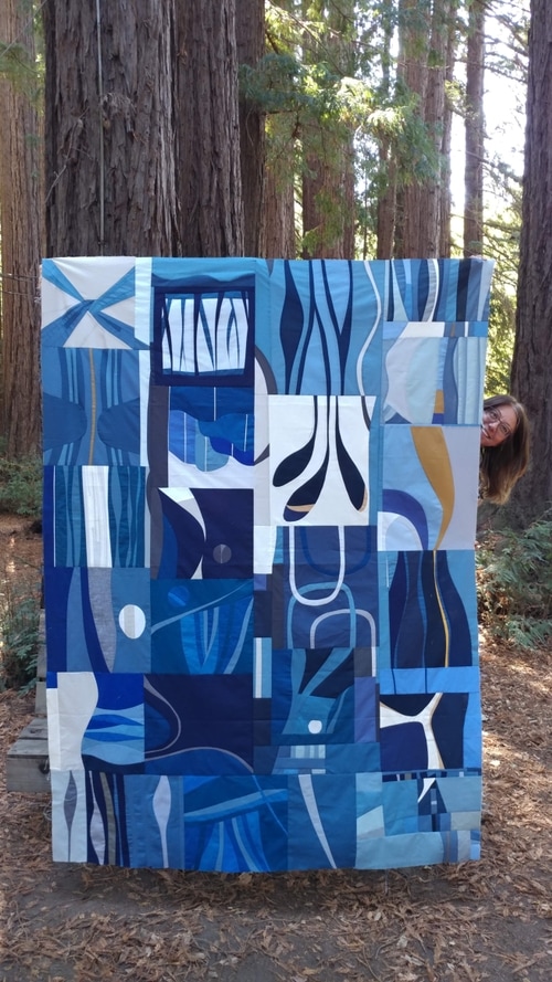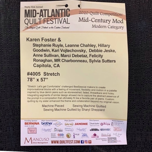 TRETCH was presented at the Modern Quilt Guild’s annual QuiltCon 2019 in Nashville. Creative collaboration is an incredible experience. Sister Karen is one of many talented quilters in the Modern Quilting Bee called BeeSewcial. Monthly, with an inspirational theme and color palette, this group produces some amazing innovation pieces. I am honored to be part of the final assembly applying a variety of quilting motifs. "Stretch" won second place in the Mid-century Modern category at the 31st annual Mid-Atlantic Quilt Festival in Hampton, Virginia in 2020.
